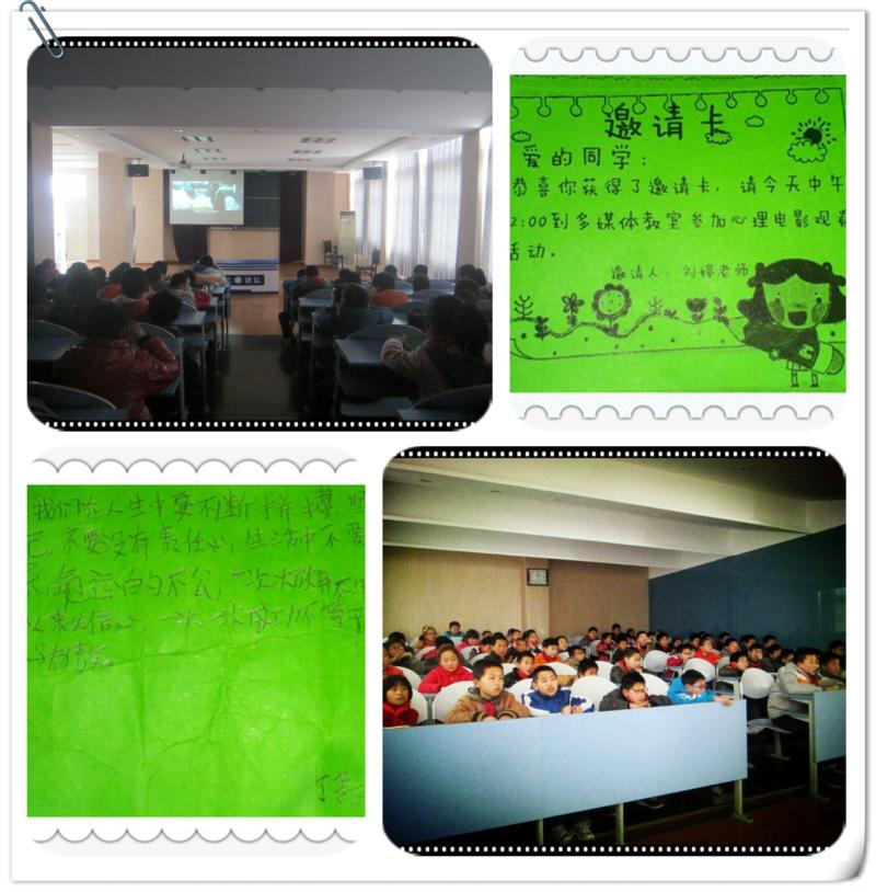 《当幸福来敲门》》(The Pursuit of Happiness)取材真实故事。故事的主角就是当今美国黑人投资专家Chris Gardner。成功诠释出一位濒临破产、老婆离家的落魄业务员,如何刻苦耐劳的善尽单亲责任,奋发向上成为股市交易员,最后成为知名的金融投资家的励志故事。观看结束后,孩子们在美丽的邀请卡后面写下了自己的心灵体悟。有的孩子写道“里面的主人公为了自己的家人东奔西走,即便遇到众多的困难依然坚持着,我们自己也应该学会坚持”,还有的孩子写道“我们的人生要不断拼搏,坚信自己,不要没有责任心,生活中不要抱怨命运的不公……”