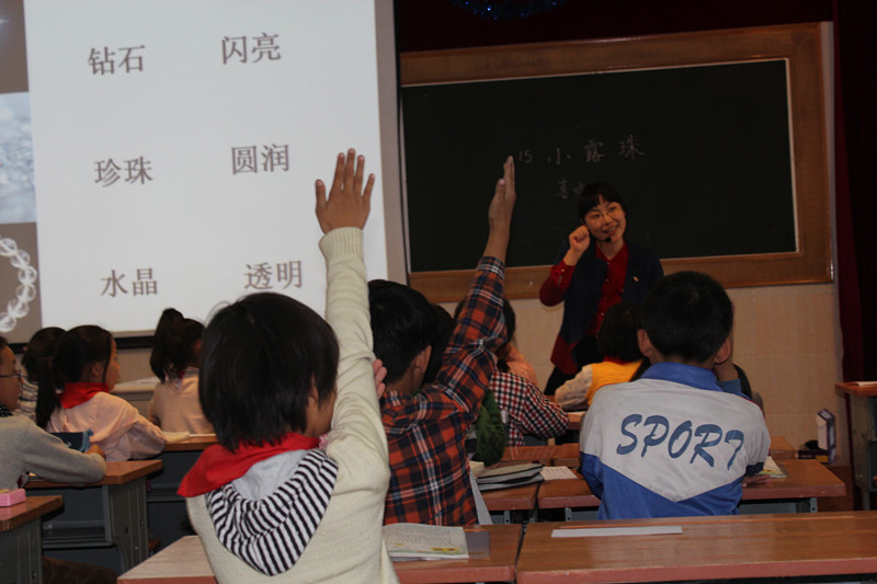 活动的开展采用“同课异构”的形式,由小河中心小学刘红莲和局小教育集团黄妍两位教师异时执教同课《小露珠》第二课时。刘老师的课堂出示大量的微距拍摄的小露珠高清图片,直观无痕地给学生解释了“闪亮、透明、圆润”三个关键词,用静态演示了露珠由小变大再消失的动态过程,再用“以读促悟”的方式推进,整节课,教师沉着机智,彰显了较高的专业素养。学生思维活跃,举手积极,展现出小河学子的良好风貌。