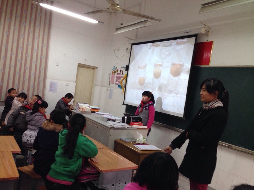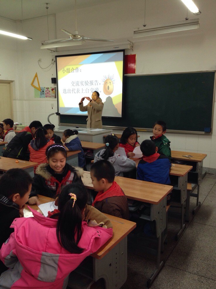 12月4日,四年级各班利用夕会时间就这个问题进行了深入的探究。为了交流时做到有的放矢,学生前一天晚上就按照实验的要求和方法进行了亲身的体验。课堂上,同学们首先在小组内交流自己的实验报告,然后,选派小组代表以PPT的形式边展示实验过程性的图片,边进行相应的讲解,同学们听得非常认真, 不仅看到了鸡蛋在盐水中浮起来的科学现象,而且还明白了其中蕴含的科学道理:鸡蛋在清水里会沉底,在浓盐水里会漂浮,只要调节盐水的浓度,鸡蛋受到的浮力和它的重力相等,鸡蛋就会浮在水面了。老师还因势利导,根据这一现象给学生们介绍有关死海的知识,让学生在感慨大自然的神奇的同时,感受到科学的力量。