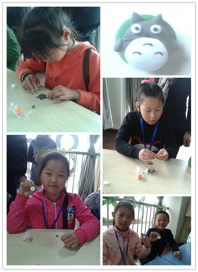 接下来就由陶泥老师带领小记者们制作卡通龙猫胸章。李老师先通过大屏幕向大家讲解制作过程,然后分发材料让小记者们动手制作。小记者们开始分块、揉、搓、按……大家互相切磋,互相讨论,不会的再问问老师,闷头忙得不亦乐乎!做好龙猫胖胖的身体,粘上尖尖的耳朵和小巧的四肢,再按上圆圆的大肚子,小小的眼珠最考验小记者们的技术了,最后再做一个彩色底座粘在金属盘上,一个卡通龙猫的胸章就制作好了。做好的小记者们兴奋地展示着自己的胸章,也有制作失败的小记者重头开始……