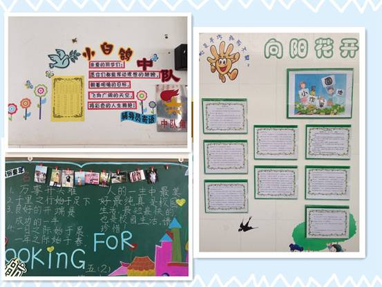 看,教室门前“向阳花开”栏目框中张贴的是同学们的得意之作;少先队角布置的新颖别致;窗边有生机勃勃的绿色植物;黑板上有孩子们们缤纷暑假生活的快乐剪影;小房间的书架上摆放着孩子们最心爱的图书;墙壁上还张贴着读书时留下的“脚印”······文化布置不仅设计漂亮,颜色搭配大方,更重要的是老师和同学们一起亲手制作的。