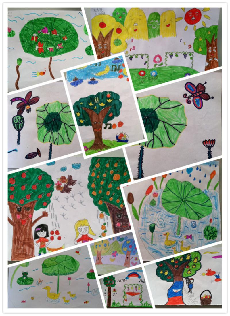 三年级的创意绘画班里聚集着热爱绘画、敢于想象的学生们。夏天的池塘里,鸭妈妈带着小鸭子游过来,小龙虾和大螃蟹举着大钳子冒出水面透气,小青蛙在大荷叶上握着麦克风歌唱,蜻蜓和蝴蝶在歌声中伴舞。秋天的果园里,果树眨着调皮的眼睛、张开双臂欢迎同学们去采摘果实。瞧,同一棵果树上居然结着苹果、梨子、桔子等不同的果实呢!