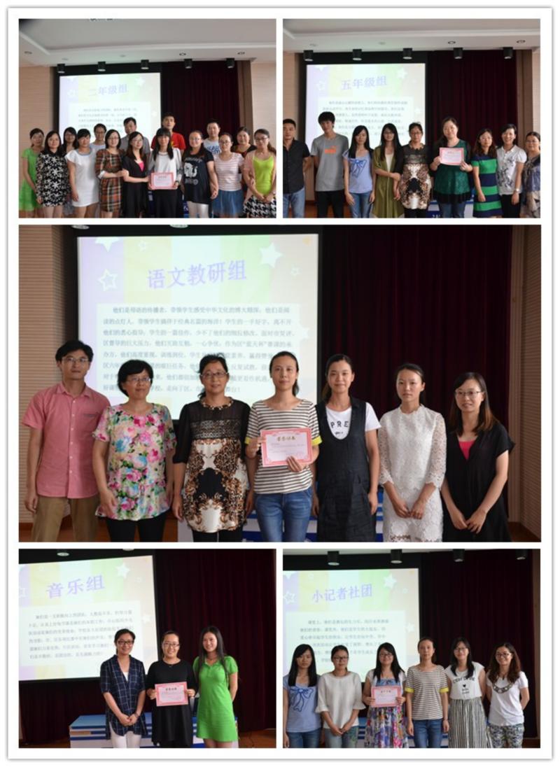首先举行的是优秀团队颁奖仪式。在为期二十天的优秀团队评选过程中,团队老师分别进行了自主申报、事迹介绍、民主测评等议程,最终有5个团队用实力征服赢得了所有老师的信任而获得殊荣,分别是二年级组、五年级组、语文教研组、音乐备课组、小记者辅导团。获奖的虽然只有5个团队,但拥有独特风景的却远远不止5个,正因为有了每位老师的不懈努力,正因为有了每个团对的全心合作,2014年度中我们的学校的许多工作才能在原有的基础上又向上迈了一个台阶。一次简短的颁奖是对团队努力的认可,也启示着所有团队在新学期里找准目标努力展示独特的魅力。