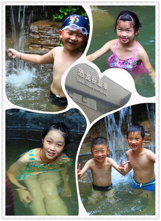 小记者们最感兴趣的当然还是下水泡温泉啦!一声令下,小记者们像出笼的小鸟,换好泳衣之后向各个温泉飞去。一开始小记者们横冲直撞,看到温泉就下去,走马观花似地泡了好几个泉,后来在其他游客及工作人员的引导下慢慢发现,温泉是用来泡的,不是用来玩水的。温泉公园的东区为原汤池区,西区为特色动感区,有旋涡池、瀑布池、沸腾池、五行池、夏枯草池、还有亲亲鱼疗区。每个池不一样,功效也不一样,温度在38-45度不等,每个汤池泡的时间不超过10-20分钟,否则容易缺氧。漩涡池:涡流按摩,松弛筋骨,消除疲劳; 瀑布池:温泉水倾泻而下冲激肌肤,畅快淋漓;精油池:加快新陈代谢,促进细胞再生……小记者们开始闭上眼睛静静地享受温泉带来的舒适以及全身的放松。