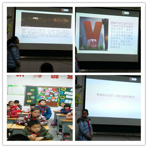 1937年的12月13日,日本侵略者攻占南京市,对无辜居民和已放下武器的士兵进行了长达六星期的血腥大屠杀昔日繁华的六朝古都顿时变成了人间地狱。让我们翻开历史,定格在那不堪回首的那一页吧!伴随着主持人的解说,四(3)班七色花中队的夕会开始了。今天是进行的是时事教育活动,主题为:《勿忘国耻,自强不息》——纪念南京大屠杀七十八周年。