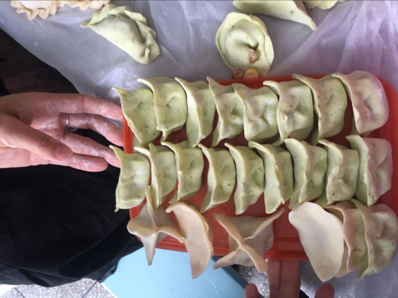 第二环节是包饺子,全体师生和志愿者家长齐聚三楼食堂,孩子们摩拳擦掌,迫不及待要露一手啦!他们以小组为单位,你一块,我一块,纷纷拿起饺子皮,添馅儿,对捏,两边捏,一个基本模型的饺子出炉啦!看似动作简单易操作,可是第一次包饺子,孩子们难免不熟练,有的饺子馅放多了,挺着圆滚滚滚的肚子裂开了缝,有的馅少了,瘪瘪的,无精打采地贴在桌子上,有的在对捏前的边沿上蘸多了水,黏黏地粘在手上捏不住......看着这些“囧”态饺子,孩子们哭笑不得!家长和老师们赶紧补救,现场再教几遍,讲清楚包法和注意点,再加上孩子们互相学习,他们包得越来越标准了。孩子们越包越熟练,半个小时过去了,桌子上整齐地排列着形态各异的饺子:有三角形的,有玫瑰花形的,有柳叶形的,还有老鼠形的......他们在原有的基础之上改变包法,让创新的思维之花在指尖绽放!