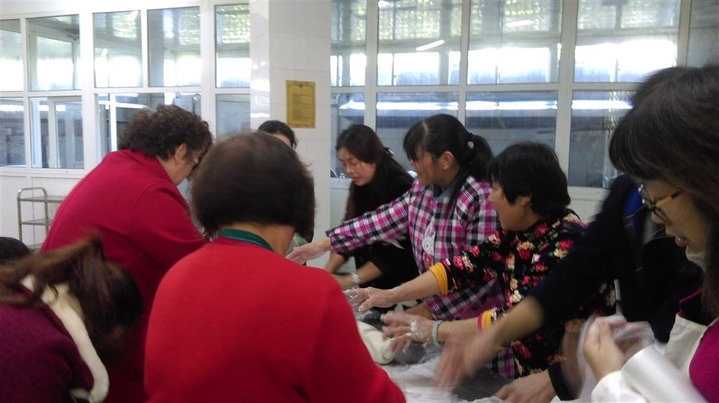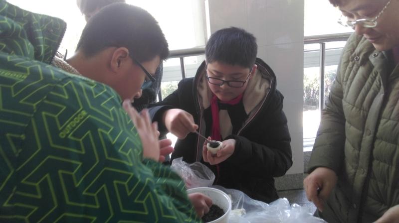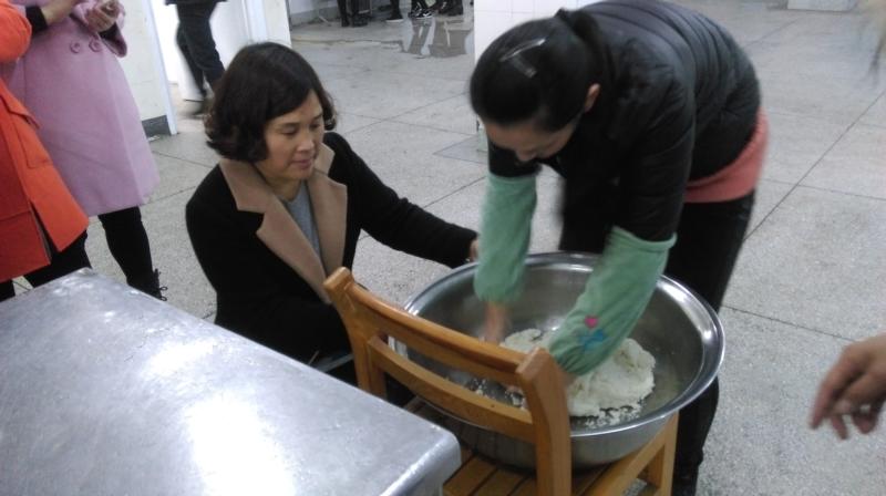 家长志愿者们早早地来到了食堂,和食堂师傅们一起做准备工作:和馅、揉面团,忙得不亦乐乎。准备就绪,同学们就整队来到了食堂,先认真听完家长们的详细讲解,然后大家就迫不及待地学着用手沾上面粉,捏了一把面团,搓成圆球状,用左手大拇指按进去,右手帮忙一起捏,捏成一个碗状,再把馅填进去,如此成功了一半!接下来,封口是关键,调皮的馅就如同地鼠般钻进去又钻出来,又似春天遍地冒出的竹笋娃娃,弄的雪白的面皮变成了“大花脸”的。最后,左手拇指按住馅儿,右手虎口,沿着皮的边缘旋转,左右手巧妙配合,团子合上了“嘴”,放在掌心搓圆,一个个白嫩嫩的“大胖团子”,便成型了,垫上粽叶或胡萝卜,置于蒸架上,送进蒸箱,大功就告成了!有的同学还发挥创意,做出了各种造型的团子,虽然有的都露了馅,但创造的乐趣是无穷的。