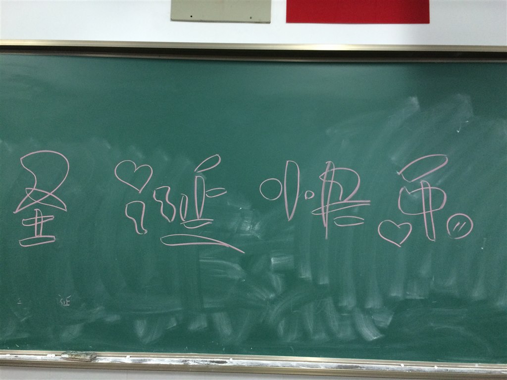 来到到教室门口,首先映入眼帘的是屏幕上投影的闪闪发亮的圣诞树,黑板上用彩色粉笔写着的“庆圣诞”几个大字。细听,喇叭里播放着悠扬的圣诞歌。同学们个个喜气洋洋,欢声笑语充满了教室的每一个角落,到处都洋溢着浓浓的节日气氛。