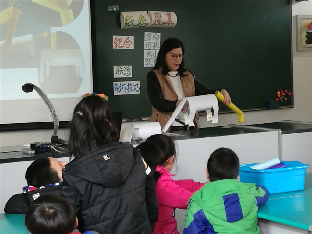 活动伊始,由胡燕春老师执教了四年级《纸卷魔术》一课,胡老师以情境创设入手,以“苗苗”为主角展开教学,借助“纸卷”这一素材,引导学生通过想象、运用相关的方法,将纸卷变成一个有趣的新形象。课堂教学中胡老师巧妙设计分步教学、分层指导、有效示范,难点点拨,引导学生在设计中完善思维,打开想象,提高动手能力和合作能力。在接下来的评课议课过程中,教研员蒋春燕老师从思维创新、制作技法、作业呈现等方面对胡老师的课堂进行了点评,蒋老师的评价字字句句落在实处,落在细节中,起到了“四两拨千斤”之效。教研员周文雅校长从学生地位、小组如何有效合作等角度提出了自己的宝贵意见。