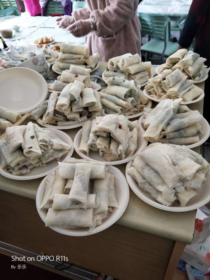 最后孩子们在家长和老师的指导下,亲自动手包春卷。家长们带去的配料可真是够丰富的,豆芽、海苔、红萝卜、豆芽……看到这些菜,小朋友们动手的欲望一下子就膨胀起来。开始包春卷了,这些新手们都在家长的带领下,一步一步地慢慢操作。先把一张完好无损的春卷皮平平整整地摊在盘子里,再用筷子夹起一大块馅放到三分之一处,然后把靠自己一边的春卷皮完里卷。卷到一半时,家长会帮忙把两边的皮子往中间对折一下,再继续卷起来。