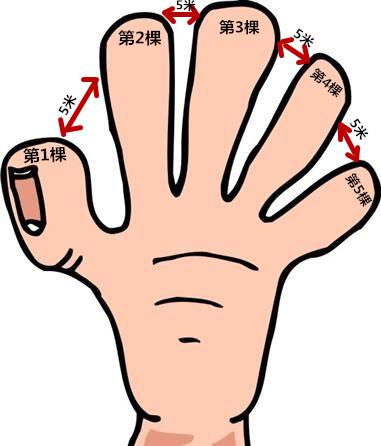 我们学着老师那样张开巴掌,认真数了起来。咦,5棵树之间怎么只有4个5米?为什么少了1个5米呢?老师看出了大家心里的疑问,依次指着手指说,“第1棵树对应第1个间隔5米,第2棵树对应第2个间隔5米,而第5棵树,因为它是最后一棵,所以后面没有了5米的间隔和它相对应,这就是5棵树为什么只有4个5米相间隔的原因呀!”