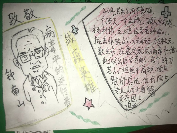 这是特殊的2020,一场新型冠状病毒疫情延长了同学们的寒假时间。大家虽然待在家中,却时刻关注着疫情的实时动态。通过制作手抄报,绘制小人书,同学们用自己的方式向病毒说“不”,给一线的医疗人员们加油。