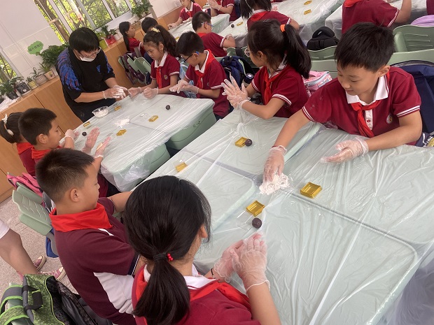 根据家长的示范,队员开始动手做月饼:首先把面团不断揉搓让其变得光滑,然后把面团捏成长条,分成4-6份;接着选择不同口味的馅料:莲蓉味、豆沙味、香芋味……把分好的面团小剂子擀平,放上馅料后再包起来揉成圆圆的团子,冰皮月饼的雏形就有了啦!最后一步,把面团放进模具里,轻轻按压模具,一个好看的冰皮月饼就完成啦!