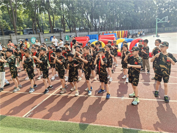 随着教官铿锵有力的指令,孩子们迅速列队,眼神中透着坚毅与果敢。孩子们精神抖擞,一招一式有板有眼。直拳出拳迅猛有力,踢腿刚劲利落,“哈!哈!” 的呐喊声响彻操场,尽显少年蓬勃朝气与昂扬斗志。通过军体拳的学习,孩子们不仅强健了体魄,更磨砺出坚韧不拔的意志,深刻领悟到坚持与纪律的重要性。