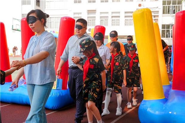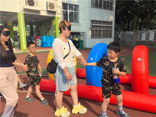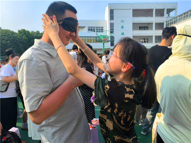 家长们蒙住双眼,将自己的信任完全交给孩子。孩子们小心翼翼地握住家长的手,用稚嫩却坚定的声音为家长指引方向在孩子的带领下,家长们缓缓绕操场行走,这看似简单的一圈,却承载着无限的信任与爱。孩子们在引导家长的过程中,学会了担当与责任;家长们则在蒙眼的体验中,感受到孩子的成长与可靠。
